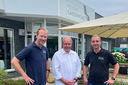 Christian Koch und Andre Lanfer von Meyer’s Gartenmöbel (Münster) überreichten an Helmut Foppe, 2. Vorsitzender von Herzenswünsche e.V., eine 2 ...